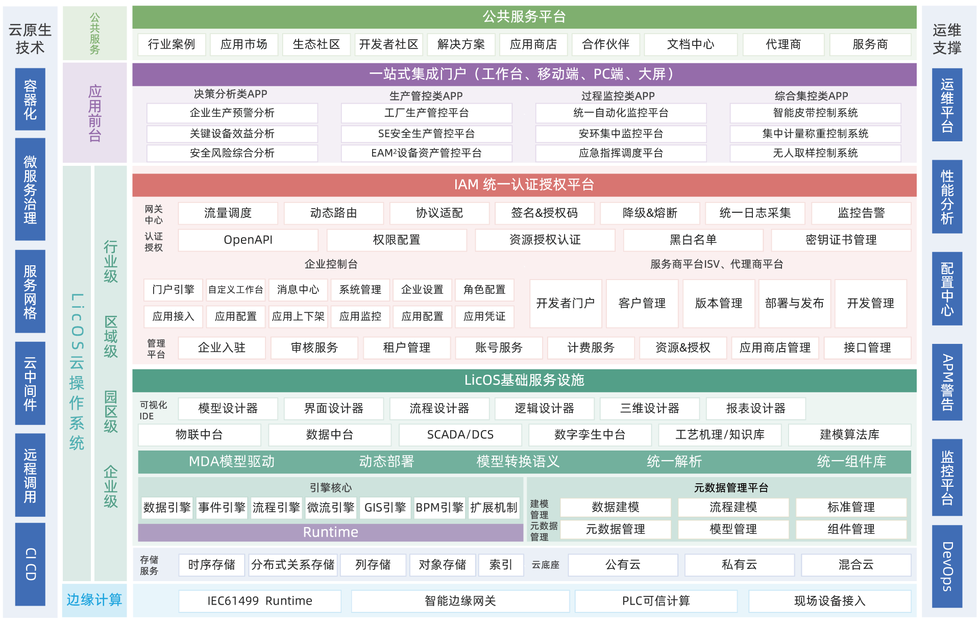 LicOS是基于云原生技術(shù)的工業(yè)云操作系統(tǒng),通過深度融合信息化與自動化技術(shù),支持海量異構(gòu)設(shè)備接入、數(shù)據(jù)提純加工、應(yīng)用快速開發(fā)與集成,邊緣端和云端能力持續(xù)融合,提供面向行業(yè)的標(biāo)準(zhǔn)化、可復(fù)用套件,圍繞企業(yè)用戶為核心,構(gòu)建行業(yè)新生態(tài)和新型應(yīng)用。